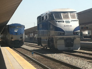 However, when I saw them this morning in the yard outside of Oceanside, they had an Amtrak locomotive hooked up at either end. (The second one is a baggage car of some sort).